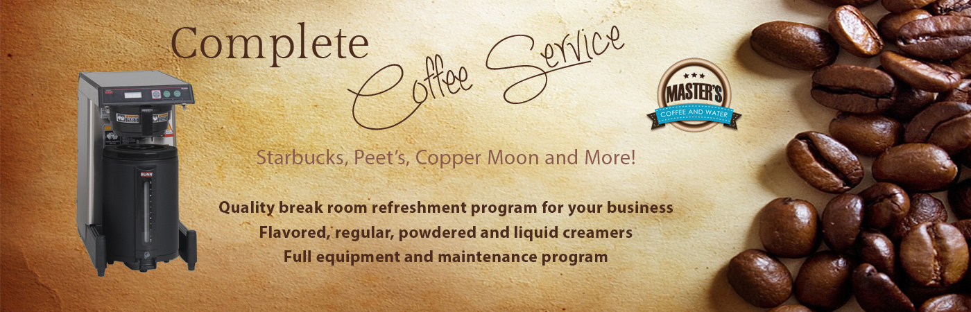 Master’s Coffee and Water Service is a 34-year-old family owned business. From bottled or filtered water to coffee by the packet, pound, or I-Kup, we want the job. We’re local and friendly, and will always give you our best effort.