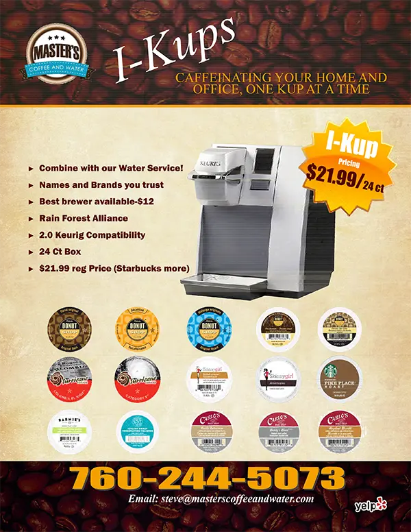 Master’s Coffee and Water is a 34-year-old Coffee and Water Service. Our origins are in the break room refreshment industry and we have hundreds of business clients in the Inland Empire, Upper and Lower Deserts of Southern California. We’ve now branched into home service and would welcome the opportunity to be invited to serve your home or workplace. Come inside, take a look and let’s do business together. We’re local, we are friendly, and Master’s Coffee and Water Service will always give you our best effort.